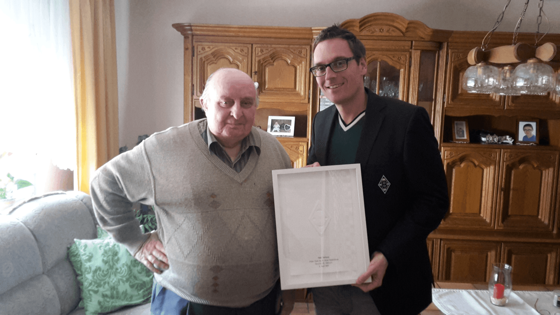 ButtonEine besondere Ehrung erhielt unser Ehrenmitglied Peter Temburg. Im September 2017 erhielt er auch die Ehrenmitgliedschaft von Borussia Mönchengladbach. Zu Hause wurde er dazu vom Leiter der Geschäftsstelle ausgezeichnet